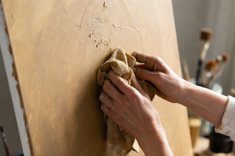 Rag painting (or ragging) is another way to build surface texture. You apply glaze, paint, or medium, then use a rag to manipulate the surface. The rag picks up some material and leaves behind other bits, giving you organic, soft texture.
